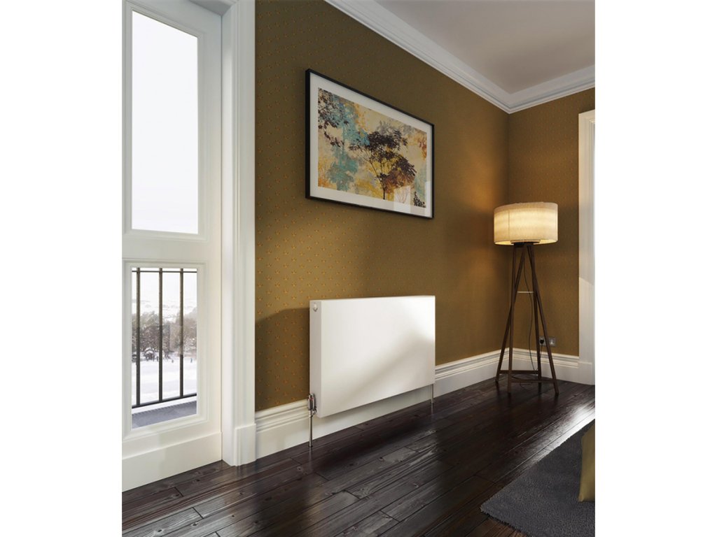 Nízkoteplotné vykurovacie teleso z jemného plechu (hrúbka plechu 1,2 ± 0,09 mm) valcovaného za studena podľa EN 442-1 s postrannými krytmi, hornou mriežkou a s hladkou čelnou doskou ako kompaktná jednotka.