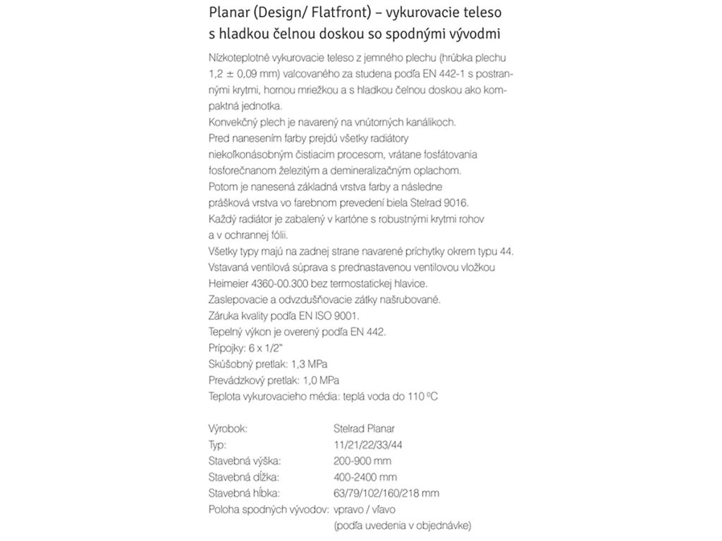 Nízkoteplotné vykurovacie teleso z jemného plechu (hrúbka plechu 1,2 ± 0,09 mm) valcovaného za studena podľa EN 442-1 s postrannými krytmi, hornou mriežkou a s hladkou čelnou doskou ako kompaktná jednotka.