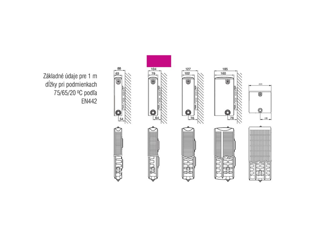 Všetky typy majú na zadnej strane navarené príchytky okrem typu 44. Vstavaná ventilová súprava s prednastavenou ventilovou vložkou Heimeier 4368 bez termostatickej hlavice.
