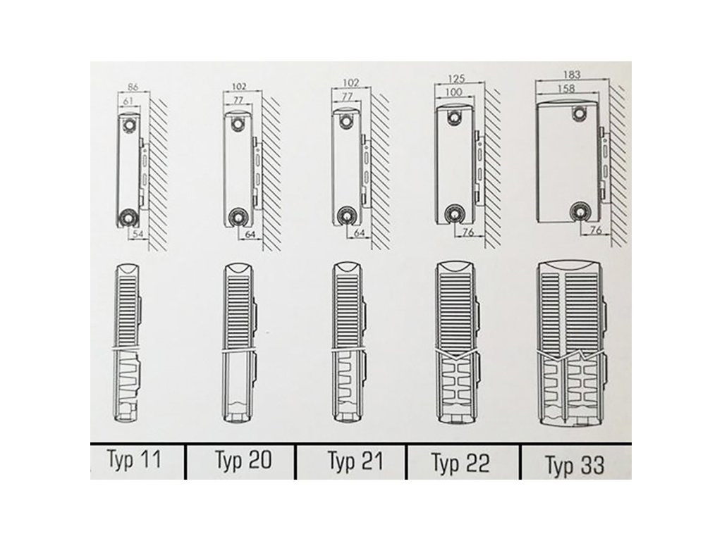 Typ: 33 znamená, že radiátor má predný, stredný a zadný výhrevný panel a v strede tri konvektory